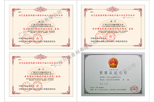 广东音响工程公司必备哪些工程资质和产品证书?不做投标工程的朋友们可能不太了解,但对于极悦娱乐广东音响工程公司来说,却是如数家珍,因为极悦娱乐音响工程公司不但是一家大型的音响生产厂家,更是一家专业做投标工程的音响工程公司,下面由小编来介绍一下极悦娱乐音响工程公司都具备哪些工程资质和产品证书。