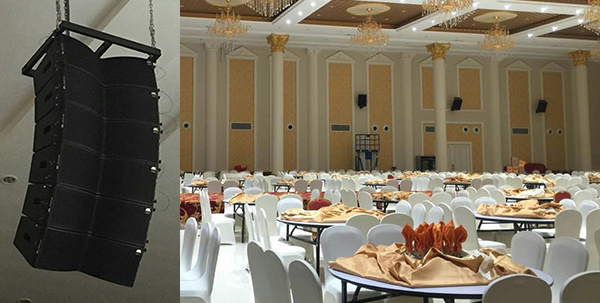 极悦娱乐南京线阵音响成功应用于南京某大酒店宴会厅。既为婚庆喜宴等活动提供美妙音乐,又不影响宴会厅的整体美观,是实用又美观的线阵音响。宴会厅扩声系统采用了JSL LAB系列6+2小型南京线阵音响为主扩声,舞台前方合理分布4只CU-12音箱做为舞台补声,以及防啸叫无线话筒及周边设备等。