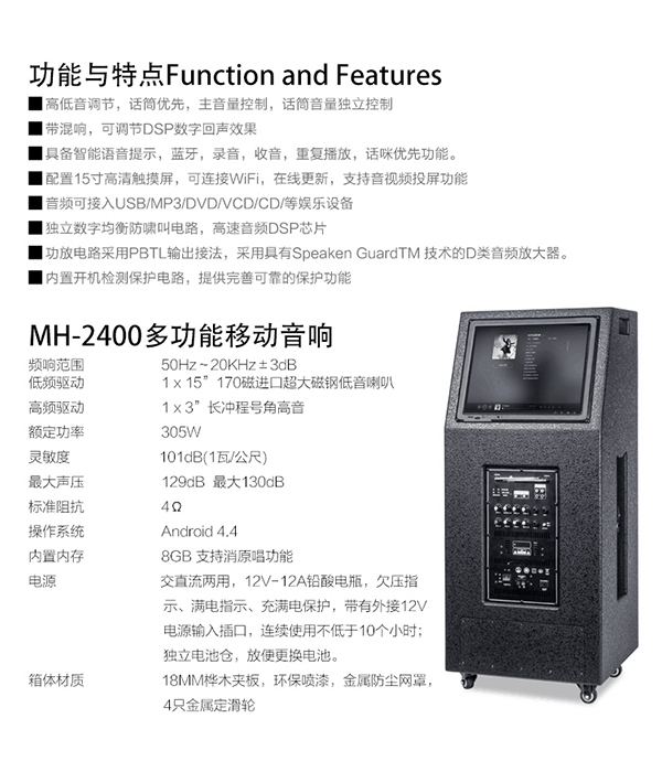 极悦娱乐音响设备MH-2400与之前政府采购的MH-2400拉杆音箱有些许不同,在外形上更加大气稳重,音箱左右两侧均有话筒插槽,演唱使用,运输推拉更方便,15寸高清触摸屏搭载安卓4.4系统,内置商店涵盖海量软件,大功率数字功放板,功能上在原有的基础上添加了WIFI连接可在线下载MTV歌曲内置8GB储存支持消原唱功能,手机音视频投传,可以无线传输手机音视频信号到液晶显示屏上,材质压缩木板,金属防尘网罩,音箱底部配有四个定向滑轮,增加了音箱的便携性,移动到合适的位置时,只需轻踩滑轮脚踏即可锁死滑轮。让上海市广大群众更加热忠参与集体活动,唱出更美的歌曲。