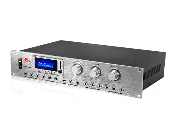 卡拉OK合并功放机DSP-666造型精致简约、设计新颖独特;我们采用双混响前级设计,卡拉OK效果更突出明显,是量贩KTV的绝佳选择;有独特的PRE、REC信号输出、RETUR、SEND功能;方便调控音质变化;有强制的冷风散热,线路设计优秀,解决了本机过载、高温等系列问题;音乐通道和话筒通道设置了高中低音的独自调节功能,让你更能找到自己所需要的效果;还设置有USB接口,没有光碟也能够播放。