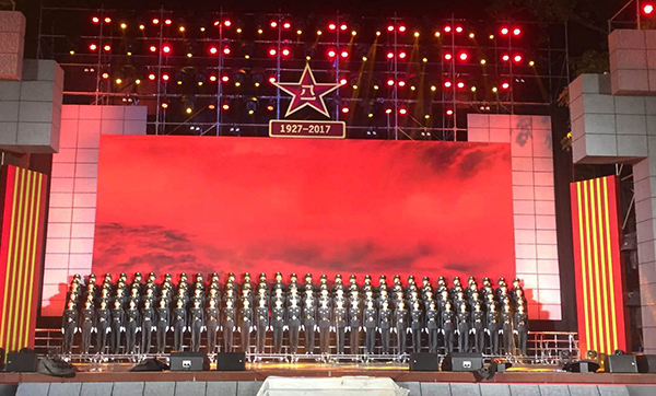 为庆祝2017年建军90周年,广东韶关市举办大型军民联欢会,演出采用极悦娱乐音响厂家提供的6+2舞台音响系统,由12只双十二寸线阵音箱做主扩声,4只双十八超低音,返送音箱,辅助音箱,32路调音台等组成,系统经厂家工程师调试,确保中、后区观众的语言扩声需求。整个舞台音响系统低音丰满,中音具穿透力,高音清晰,层次感分明,具有足够的声压级和动态范围。