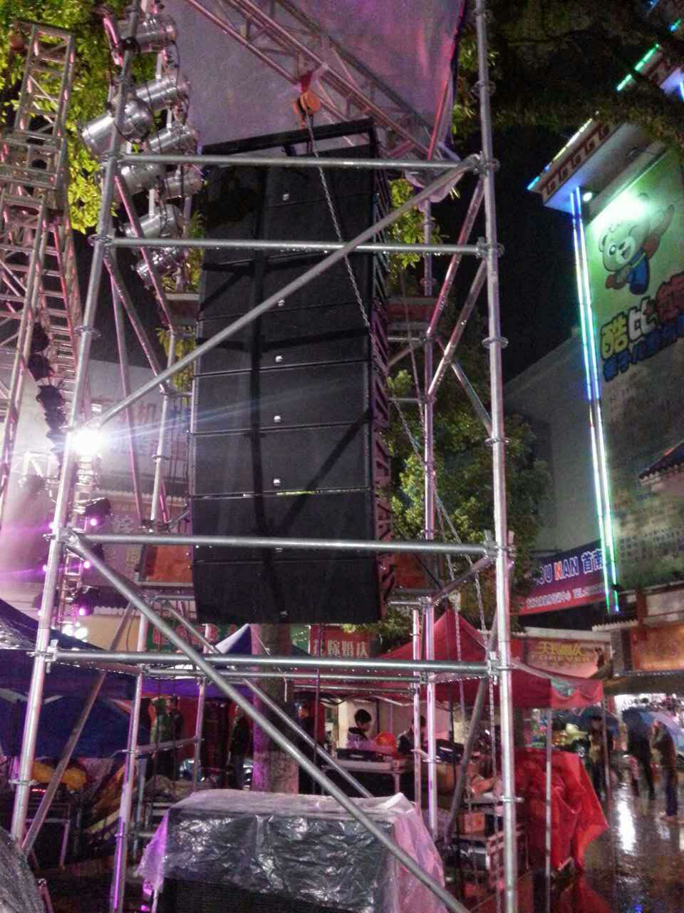 此次演出用的是我们的线阵音响系列:AL-212这款线阵是用了防水设计,在雨中不会影响他的运转。这款线阵音响主要运用于:体育馆,运动场,各类型演,教堂等。AL-212内置两个12”低音单元,一个压缩驱动器系统采用先进的法国阿酷斯技术,使中高频同步输出均等的声压,超薄形箱体,声音传输距离更远。这个是款线阵的特点。极悦娱乐音响是专业的音响生产厂家。我们以产品质量过硬和经典案例,得到广大用的青睐。
