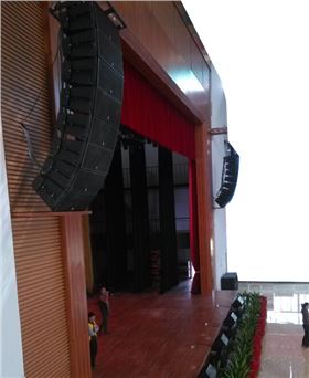 其次,极悦娱乐音响厂家从建筑构造设计上充分考虑了整体建筑的节能环保的设计理念,为能与前期的节能环保理念相结合,在方案设计中,音响设备的布置方式上也充分考虑这一理念。此设计配置的该多功能舞台音响系统时,采用集中与分散相结合的扩声方式。为了使观众区里不同位置的观众能听到同等素质的声音,在多功能舞台台口上方左、右各设一组线阵音响系统,每组由8只双10寸线阵音箱和3只单15寸低音炮组成,在台唇位置设置4只10寸全频音箱,作为补声音响,还配置了6只12寸全频音箱做为舞台返听音箱。