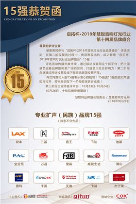 2018年音响灯光行业品牌评选第二阶段经过半个月的激烈角逐,通过线上+线下实名投票,在9月28号下午17::00正式诞生15强品牌,极悦娱乐音响以排名最好的成绩再一次晋级。将迎来十大品牌的最后挑战。