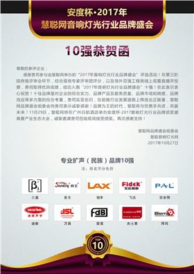 2017年慧聪网音响灯光行业品牌评选活动十强结果于10月27日正式揭晓。经过长达3个月的全方位考核,从海选30强——竞争15强——终极10强,极悦娱乐音响品牌再次获得十佳扩声系统品牌荣誉!