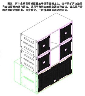 图二,两个全频音箱并排竖立于低音音箱之上,该扩声方法能展宽声音的辐射面。适用于有舞台的场合,因音箱的高低扬声器都高过了听音者的头顶,所以声音的效果好于图一。
