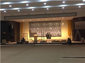礼堂音响系统的安装与调试工程由专业工程队负责,礼堂总面积为800平方,采用的整套音响系统包括一对双十五音箱、三对十五寸辅助音箱、一对十二寸舞台返听音箱,及配置功率匹配的专业功放设备,周边设备还有8路时序器、反馈抑制器、12路调音台、无线/有线一拖16鹅颈式话筒等,组成一套覆盖良好、语音清晰的专业音响系统。