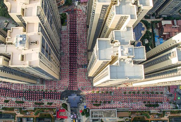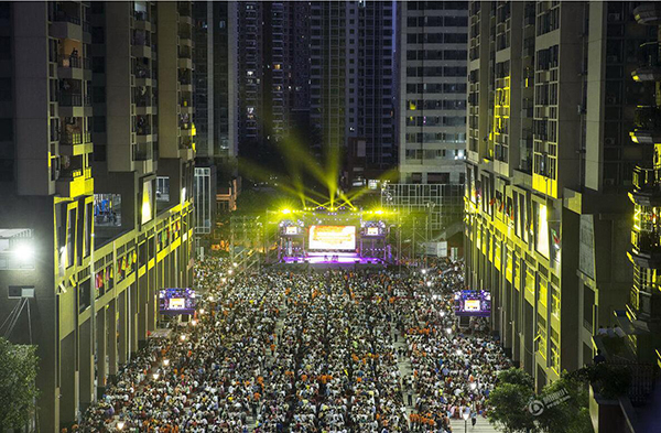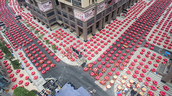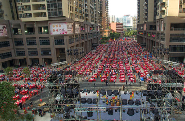千围宴,万人席。摆宴席的小区内楼间距70~80米,红桌从四周排向舞台聚拢,呈“T”字型,场面十分壮观。这场盛大的回迁庆典总共“开台”1500桌,全小区4000多户业主都来参宴。据现场一位工作人员透露,原本预留的15000人的席位,已是座无虚席。