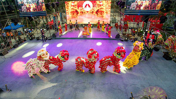 回迁宴一直持续到晚上10点,村民们边吃边看表演,演出的开场是广东民间传统舞狮子,寓意好的彩头,还有歌舞、魔术表演等。