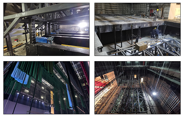 舞台机械系统是实现舞台表演多样化的硬件支撑。舞台机械分为上部机械与舞台下部机械。舞台上部机械包括:防火幕、台口幕、布幕吊杆、灯光吊杆、灯光吊笼、柱光架、舞台口、吊点机、大幕拉幕机、电影宽银幕等。下部机械包括:升降乐池、升降台、转台等。为演员的表演提供丰富空间变化,让舞台机械的操作与表演内容无缝衔接,增强演出的流畅性与观赏性。