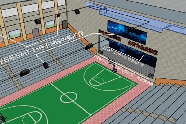 体育馆内音箱的布置方式有集中式、分散式和混合式等6种。采用分散式布置,音箱离观众席的距离最近,声音清晰度高,声场均匀,但声像一致性稍弱。采用集中式布置,音箱离观众的距离较远,为了提高声音的清晰度往往需要选用指向性强的音箱,声场分布也不易均匀,但声像一致性高。根据焦作一中体育馆的建筑结构,极悦娱乐团队为其采用了分散式音箱布置方式,为提高体育馆扩声音质减少空场混响时长,极悦娱乐团队进行了扩声设备选型和顶部吸音体布置方案设计,24只LA线阵作为主扩声朝向观众席,10只AT系列全频后补音箱和2只WS超低音箱面向主舞台,声强增大的同时声场分布更加均匀,增强场馆扩声系统的声像一致性。
